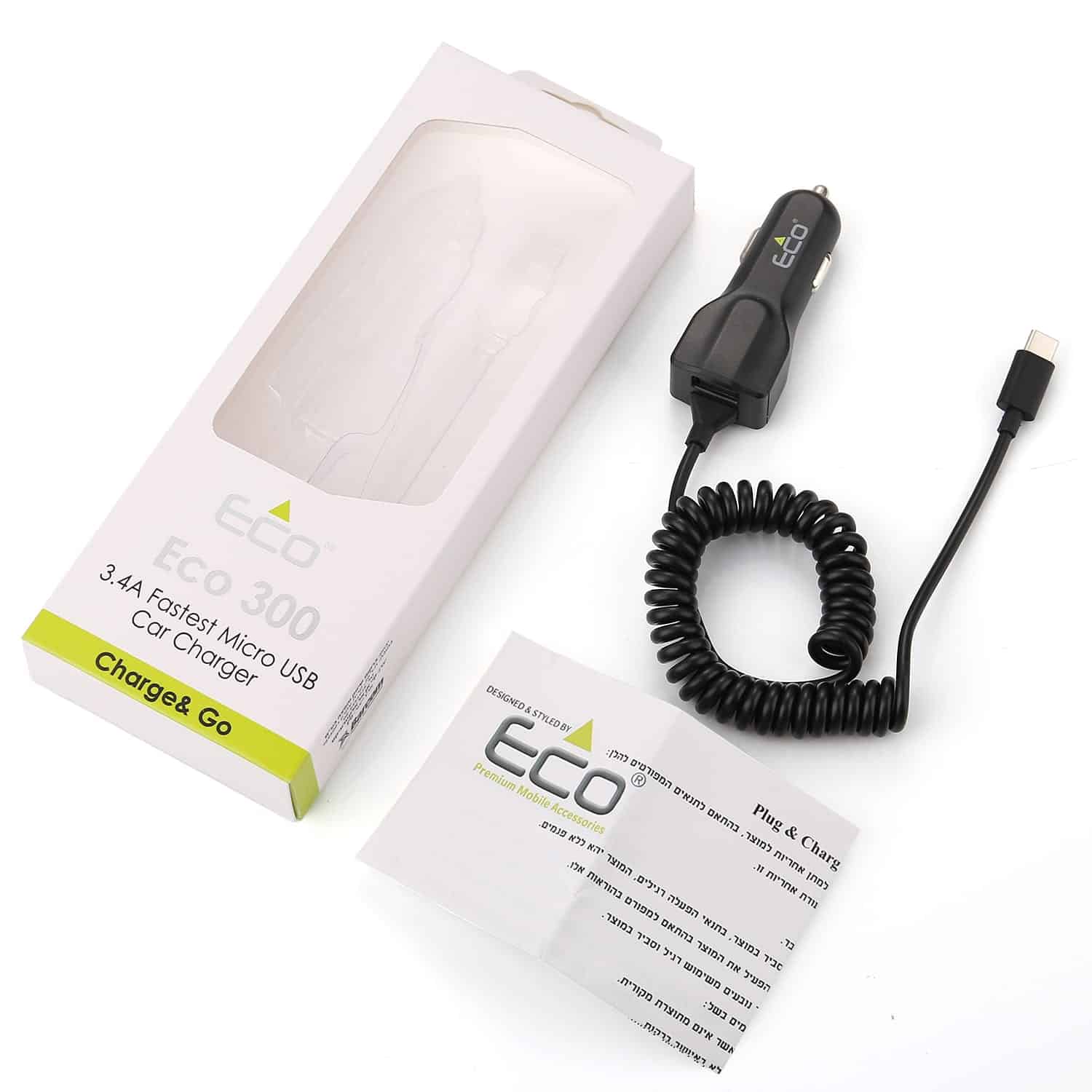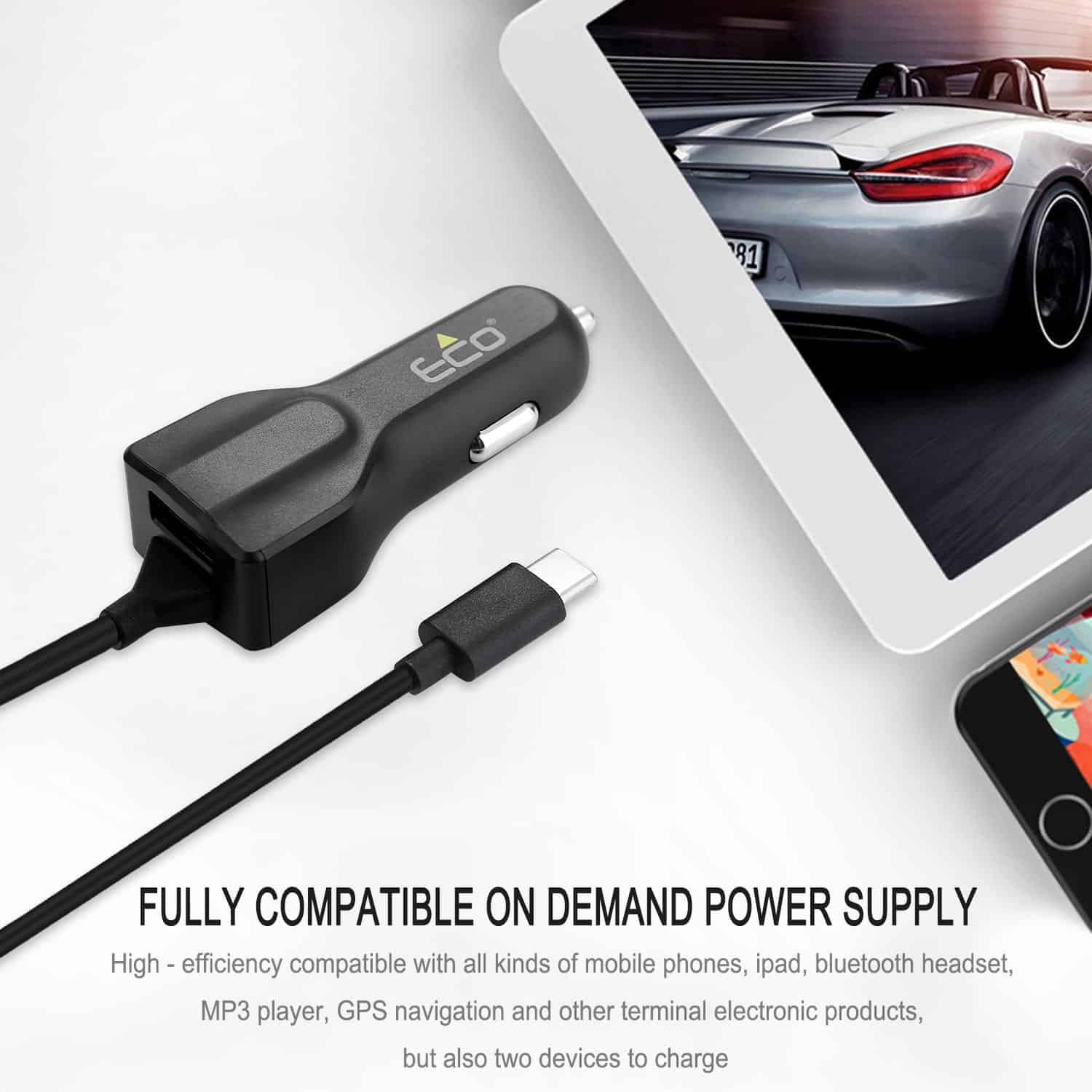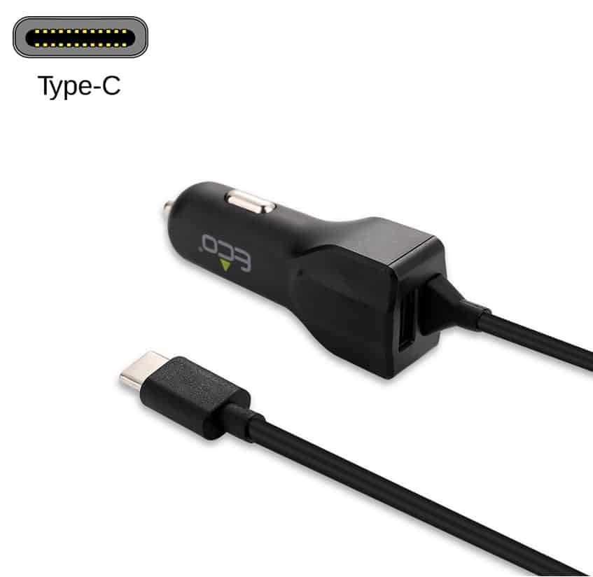 Charge Two Devices on the Road The Eco 320 is a compact and reliable in-car charger designed for smartphones and tablets with Type-C ports. It features a built-in 1-meter cable for your primary device and an extra USB-A port for charging a second device simultaneously — perfect for daily commutes, road trips, or professional drivers on the go.