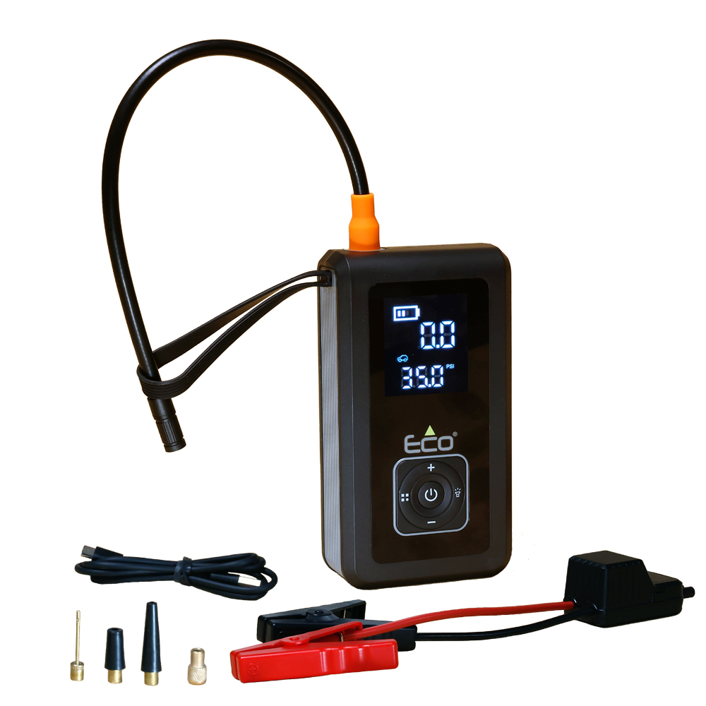 The ECO JS‑1000 is a powerful all-in-one emergency tool designed for real drivers. It combines a high-capacity jump starter, fast air compressor, bright LED flashlight, and mobile power bank — all in a rugged, portable case. With a 12,000mAh battery, 1000A peak current, inflation pressure up to 150psi, and USB-A and USB-C ports, it’s ready to rescue your battery, your tires, and your devices — anytime, anywhere.