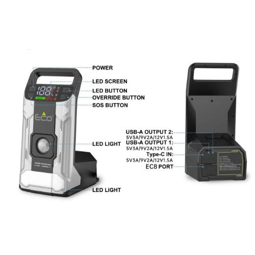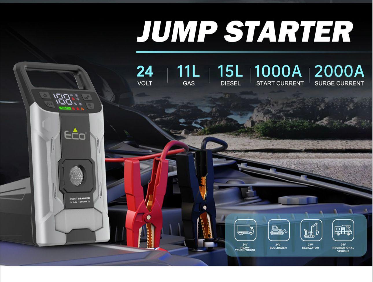 The ECO-JSTR2000 is a high-capacity 24V jump starter built to handle the demands of heavy-duty vehicles — from freight trucks and buses to bulldozers and excavators. With a powerful 2000A surge current and intelligent protection, it delivers reliable starts even in extreme cold. And when it’s not reviving engines, it doubles as a power bank and emergency LED light.