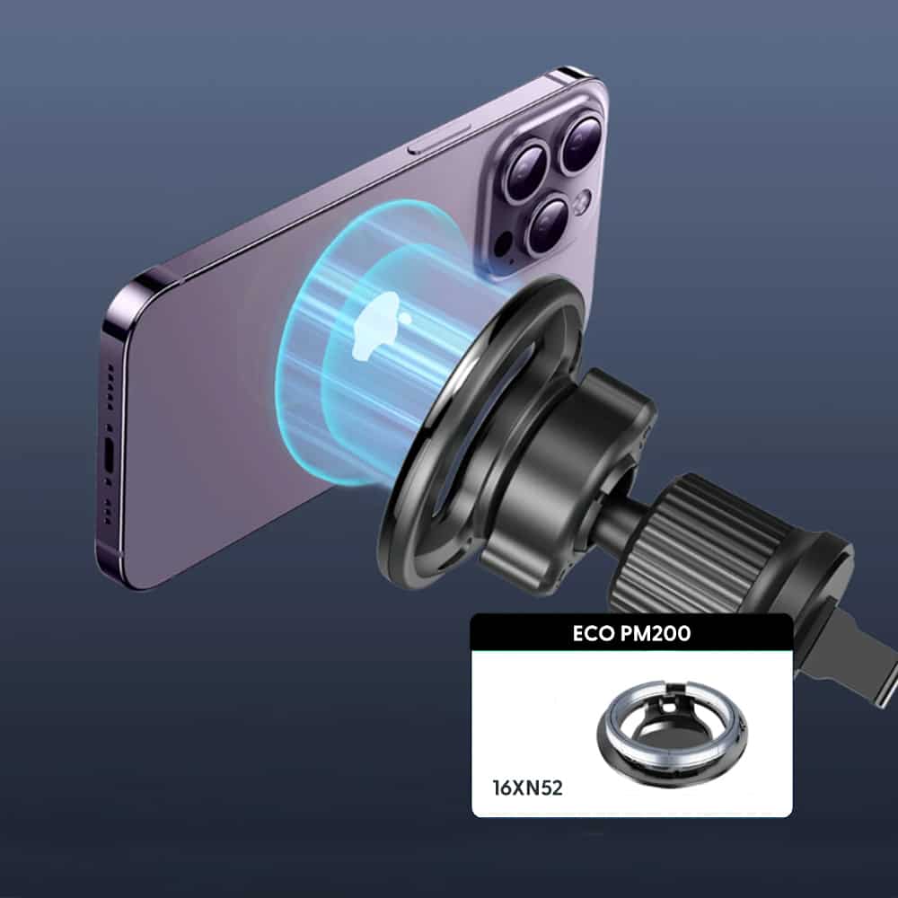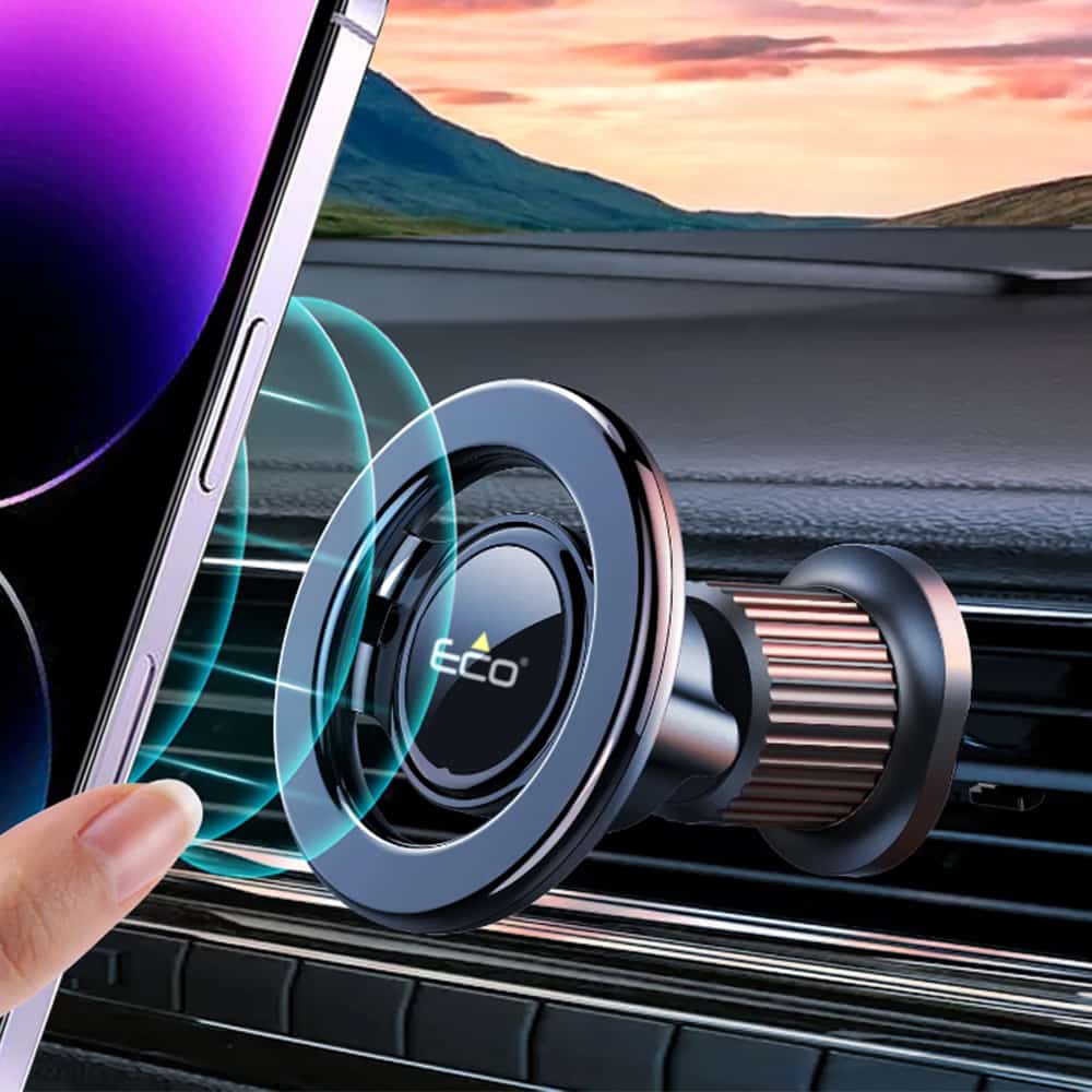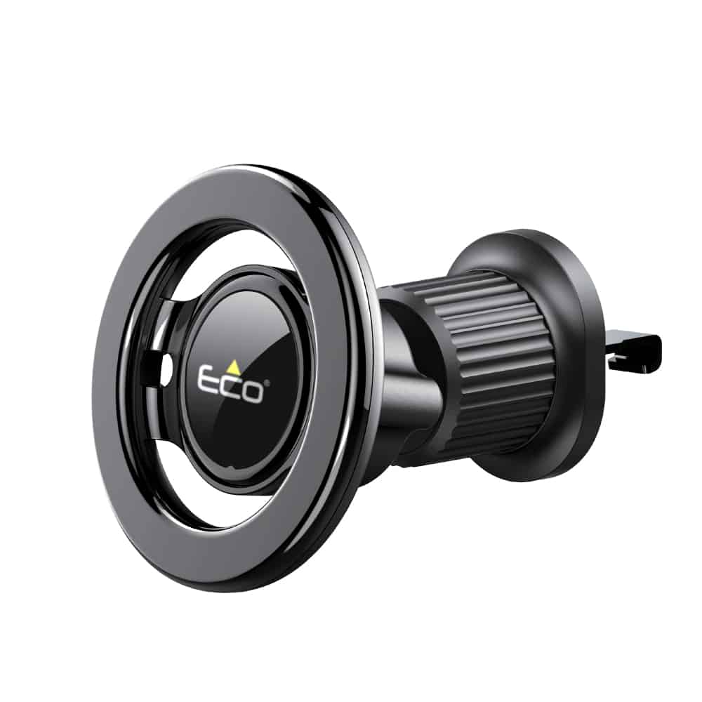 The ECO PM200 is a sleek and powerful magnetic car mount designed for iPhone 12 and newer models with MagSafe® support. It securely attaches to your vehicle’s air vent and offers seamless one-handed operation. For users of other smartphones, the box includes two universal magnetic rings to enable strong and stable attachment. With a premium anti-scratch finish and compact form, the PM200 fits neatly into any car interior.
