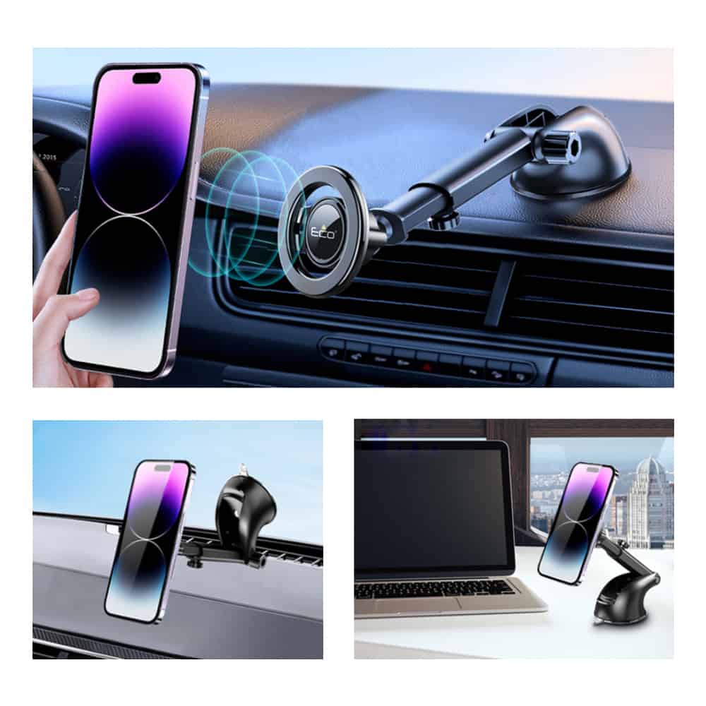 The ECO PM210 is a versatile magnetic car mount built for MagSafe® iPhones (12 and above). With a strong vacuum suction cup and an adjustable telescopic arm (113mm–167mm), it attaches securely to your dashboard or windshield for the perfect viewing angle. A powerful magnetic head (59mm wide) ensures reliable hold, while the anti-scratch finish keeps your phone safe. For users of Android or non-MagSafe® phones, the kit includes two magnetic adhesive rings for full compatibility.